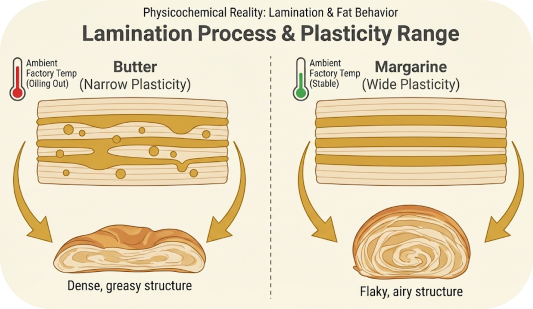 Butter has a relatively narrow plasticity range and tends to “oil out” at ambient factory temperatures during lamination processes, such as those used for croissants or puff pastry.