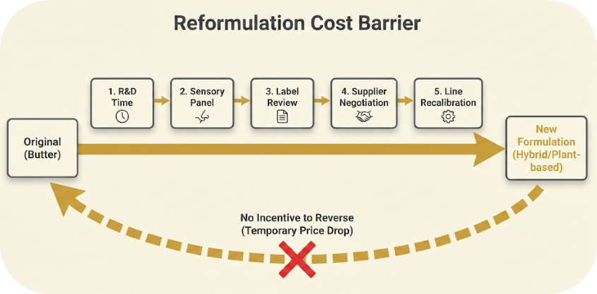 First, reformulation has a cost: R&D time, sensory panel validation, label review, supplier negotiation, and line recalibration. Once absorbed, there is little incentive to absorb it again simply because one input commodity temporarily cheapened.